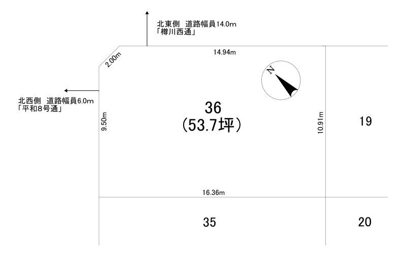 角地 北西 間口9.5m 公道 幅6m 北東 間口14.9m 公道 幅14m |